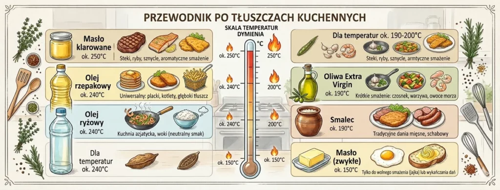 Historia z serwisu: Pamiętam nową dziewczynę w pracy. Chciała być „premium” i postanowiła usmażyć placki ziemniaczane na drogiej oliwie Extra Virgin. Po pięciu minutach cała kuchnia była w gryzącym dymie, a czujniki przeciwpożarowe o mało nie przerwały serwisu. Placki wyglądały na gotowe, ale śmierdziały spalenizną i były gorzkie. To była droga lekcja: cena tłuszczu nie zawsze idzie w parze z jego odpornością na temperaturę.