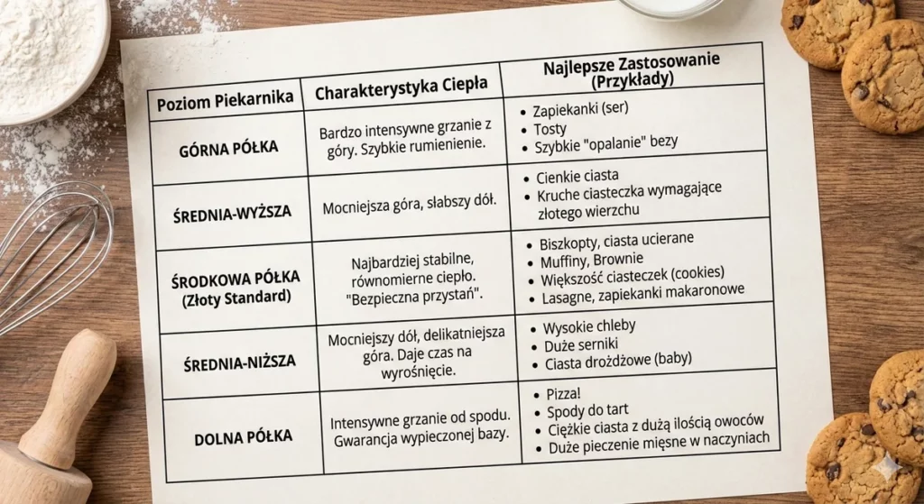 Piecz na środku: Najczęstszy błąd? Wsuwanie blachy za wysoko. Góra przypieka się od górnej grzałki, a dół zostaje surowy. Środkowa wysokość to w 90% przypadków najlepszy wybór.